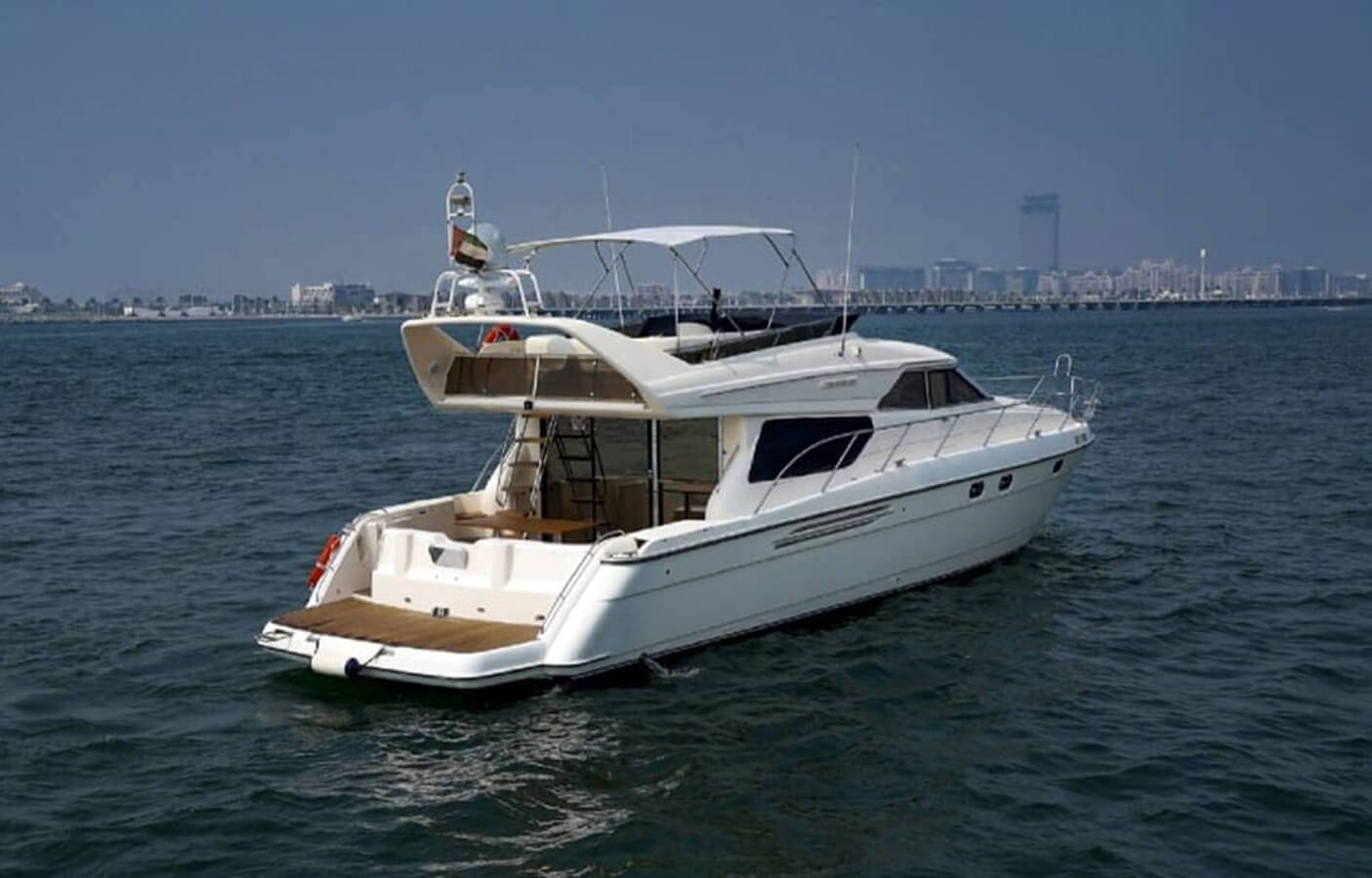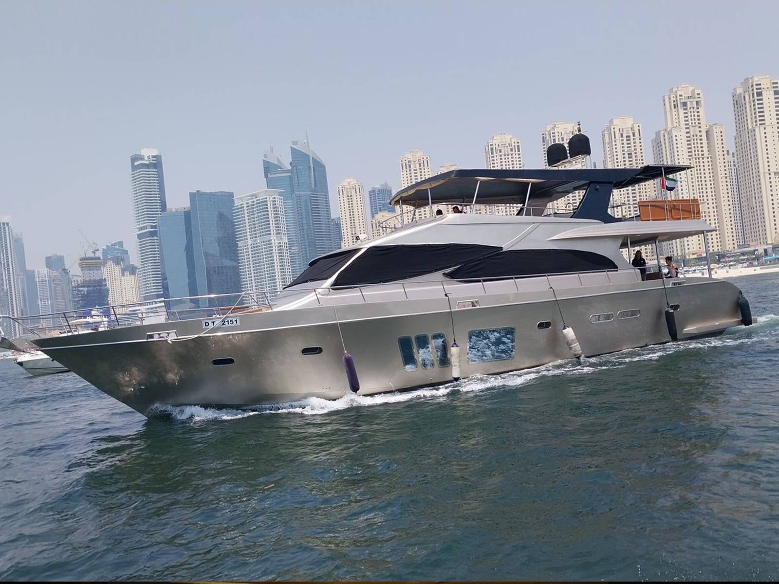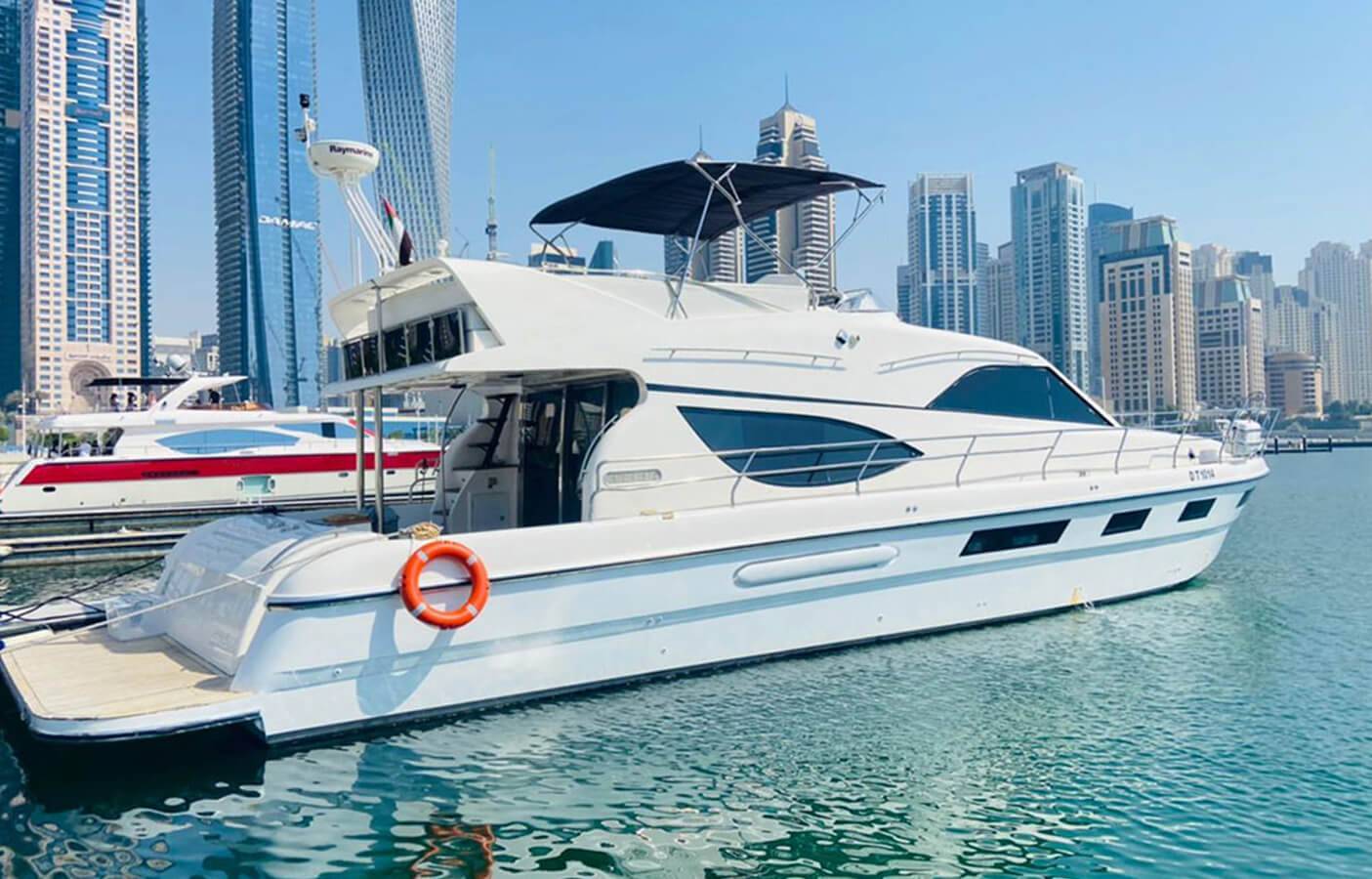 Our company is pleased to present the 88 Feet double-deck Luxury private yacht rental Dubai in Aed 799 each hour . Our Yacht, offering superb amenities for your unforgettable experience. With a spacious hall, two bedrooms, washroom, kitchen, music system, and comfortable seating on the flybridge, this yacht ensures your utmost comfort and enjoyment during your cruise.