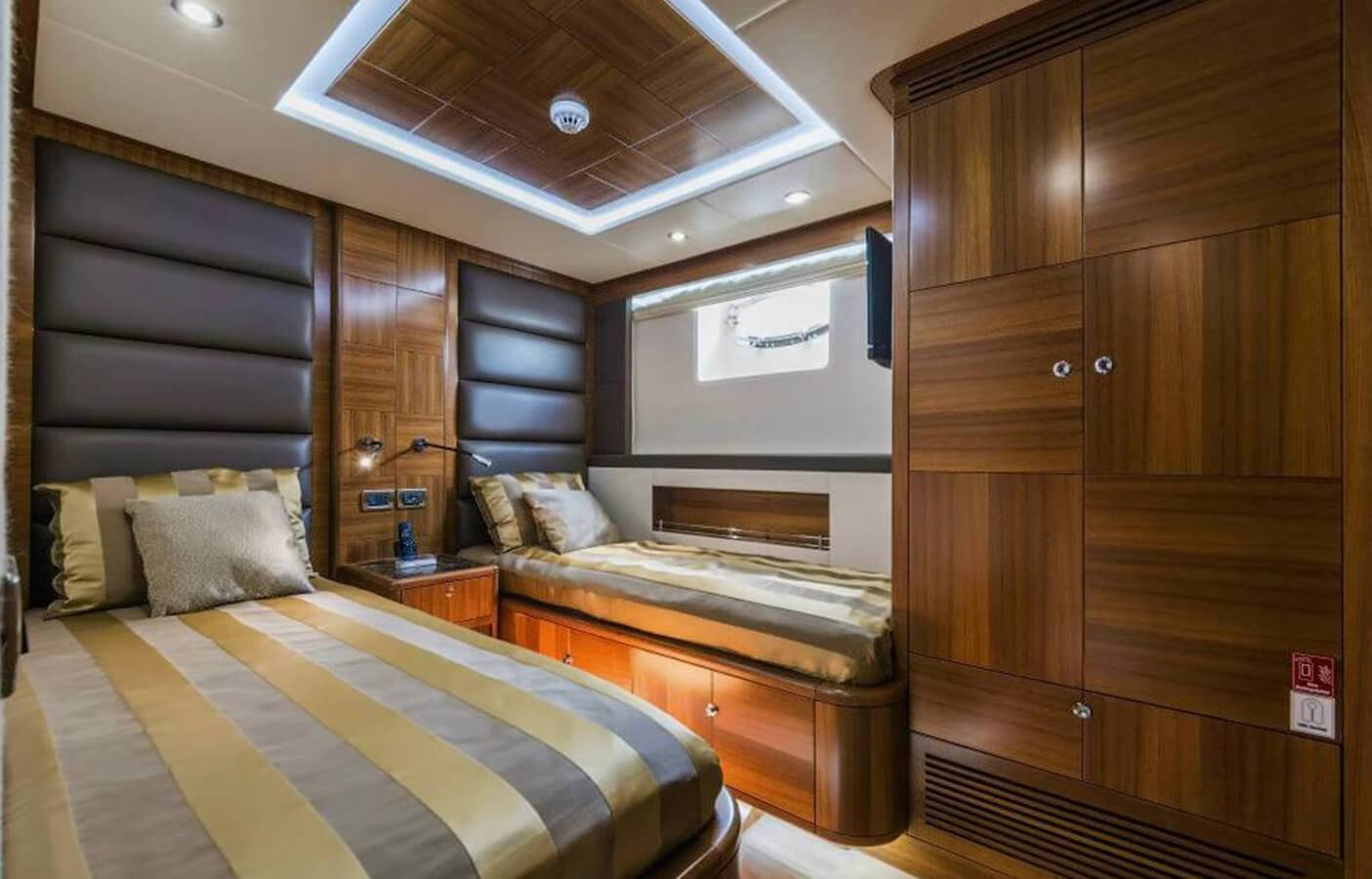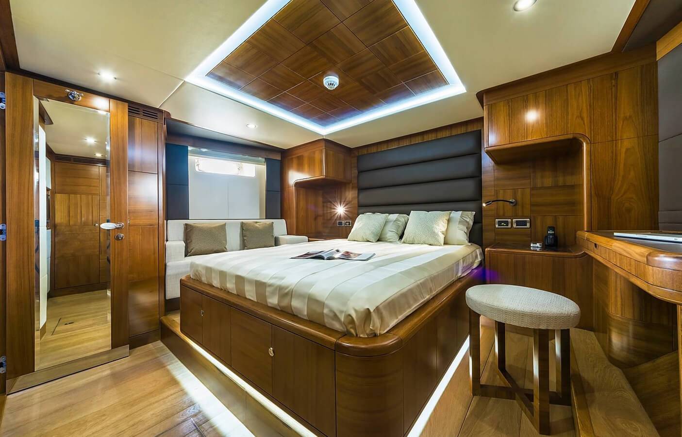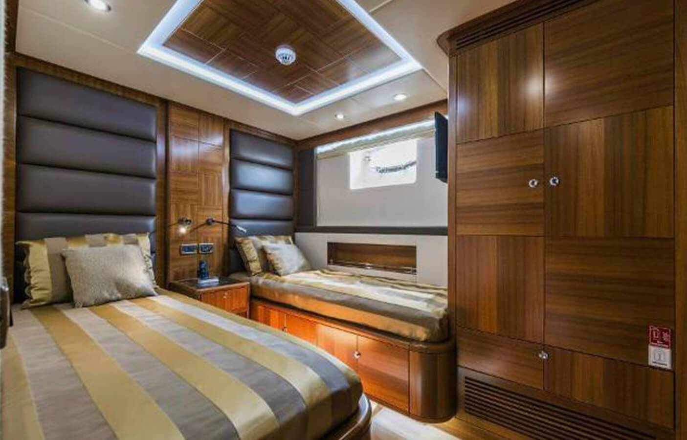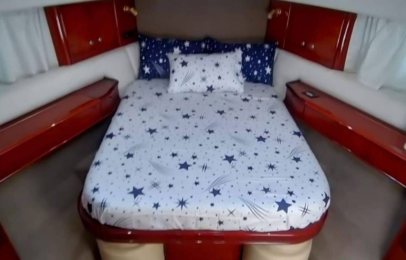 This stylishly built yacht can accommodate 15 guests at a time in its dining space both indoor and on the flybridge. It can also accommodate 6 guests overnight. There is 1 Master cabin, 1 Double cabin, and 1 twin cabin. The crew onboard ensures your comfort and takes care of all your needs, including cleaning, meals, and any help.