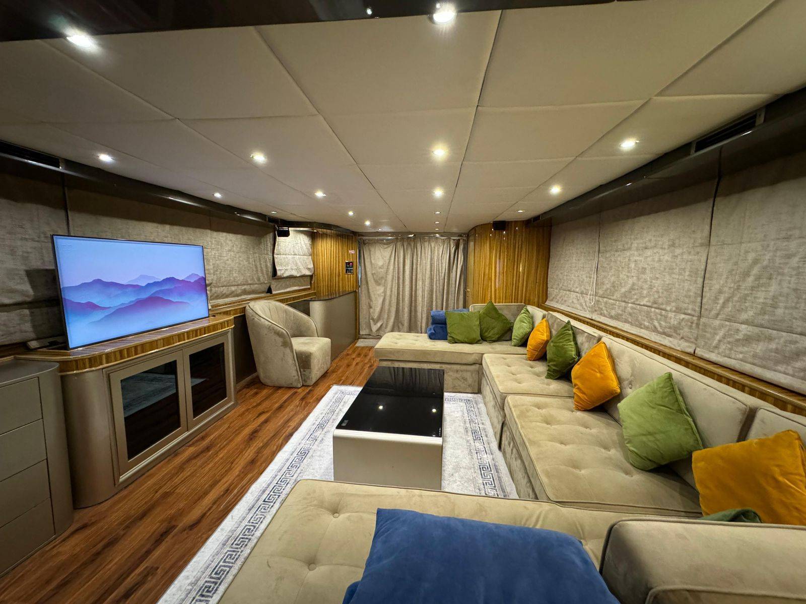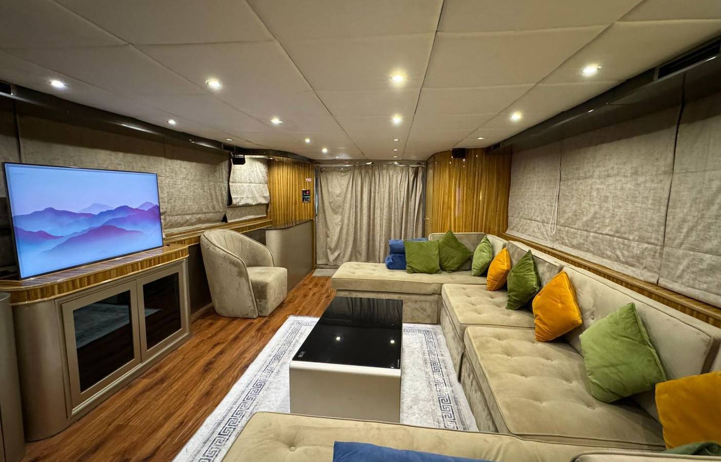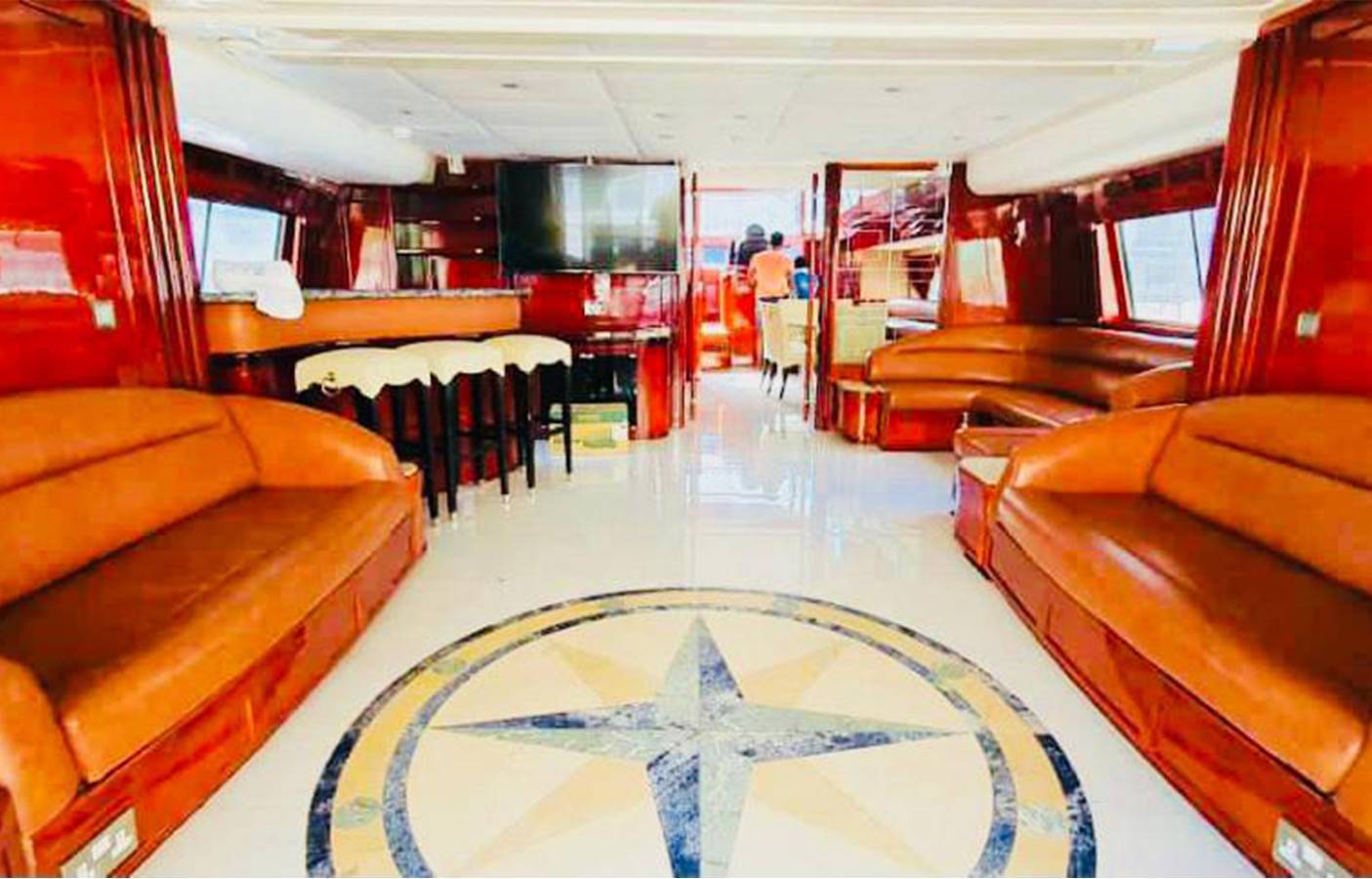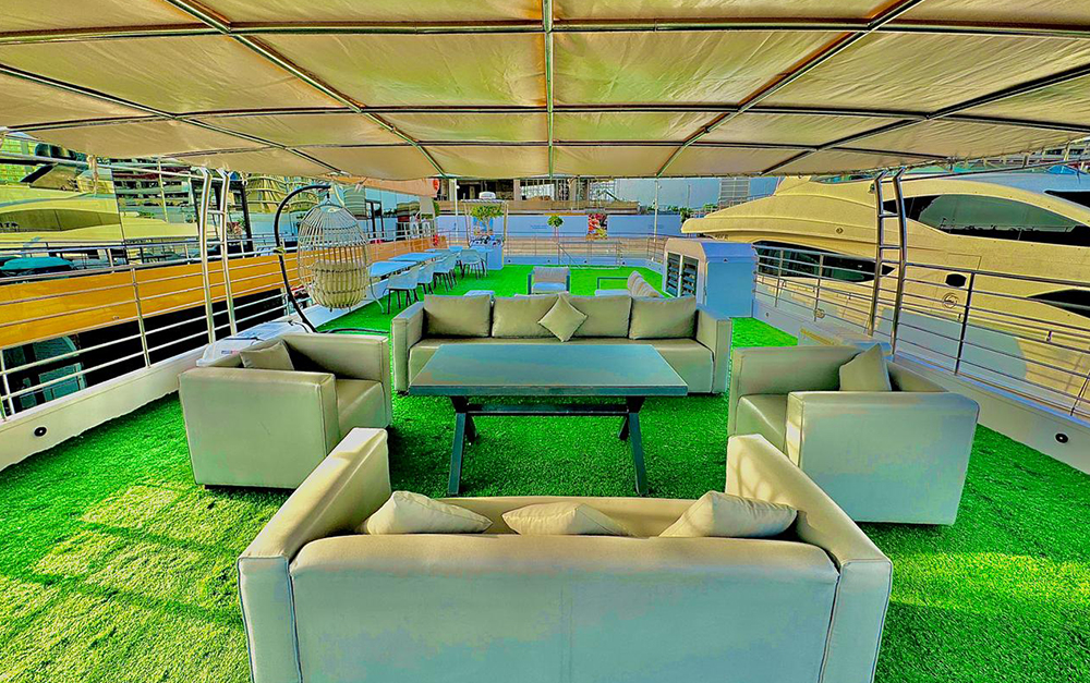 You can also make the private yacht booking of This Super Luxury 135 feet Yacht which is having 4-bed room with 2 very spacious Hall along with the washroom kitchen Satellite television, Music system and the very nice sitting place on the fly bride as well. Our price is Aed 3999 Each hour Only . Our offer include the water soft drinks and ice along with very good music system and fully Air conditioned yacht and you can also bring your own food and drinks in yacht.