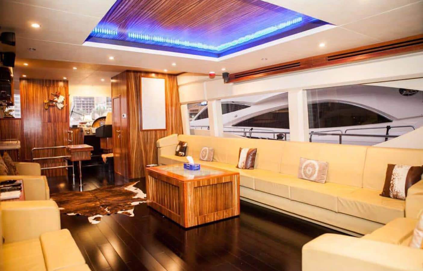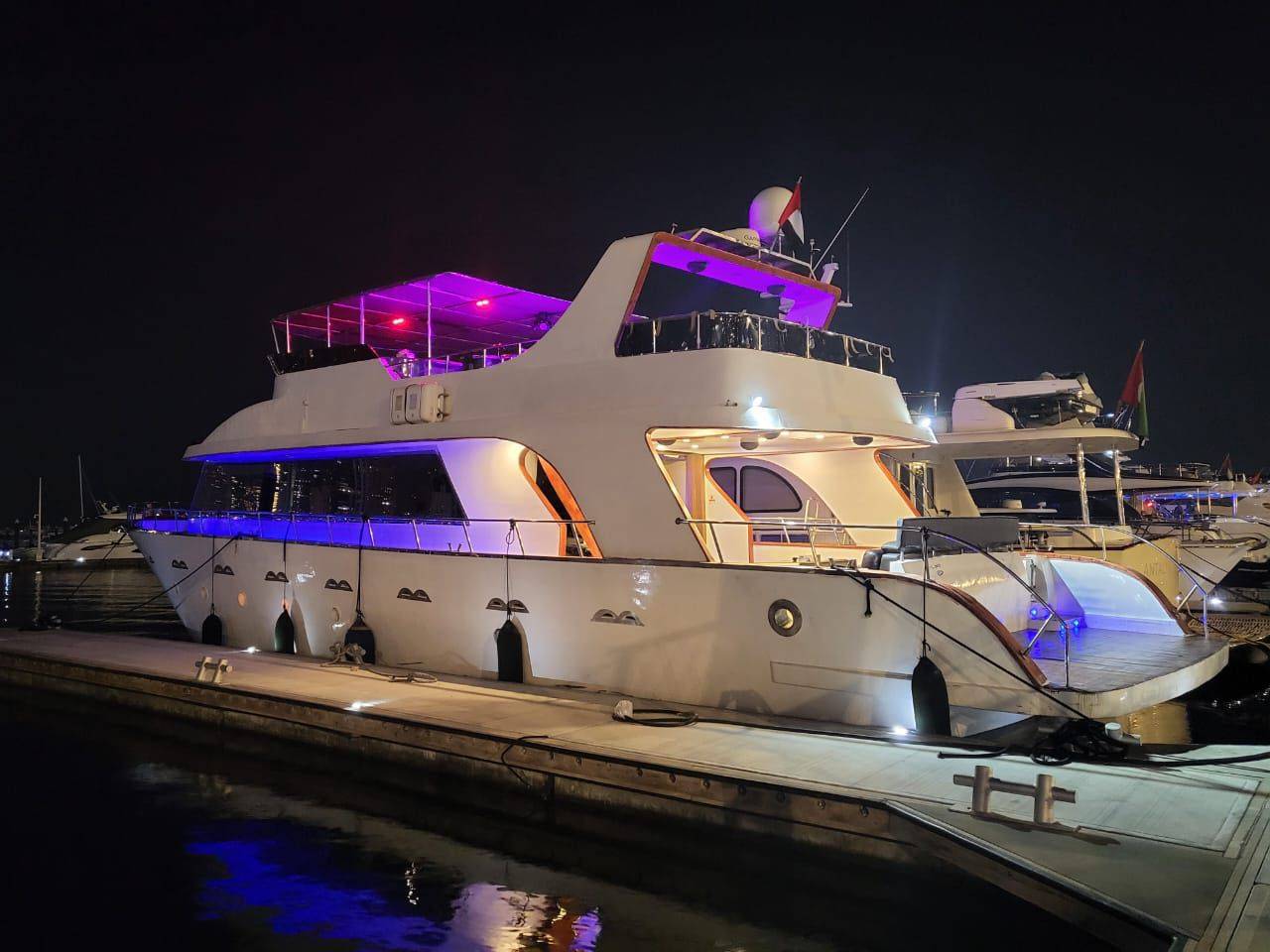 Our company is pleased to offers you the Super Luxury 110 feet Air-conditioned double-deck Yacht With with 4-bed room with very spacious Hall along with the washroom kitchen Satellite television, Music system and the very nice sitting place on the fly bride as well. Our price is Aed 2399 Each hour Only .. Our offer include the water soft drinks and ice along with very good music system and fully Air conditioned yacht and you can also bring your own food and drinks in yacht