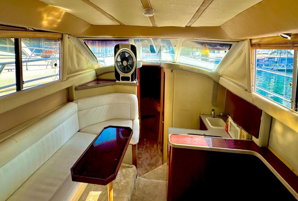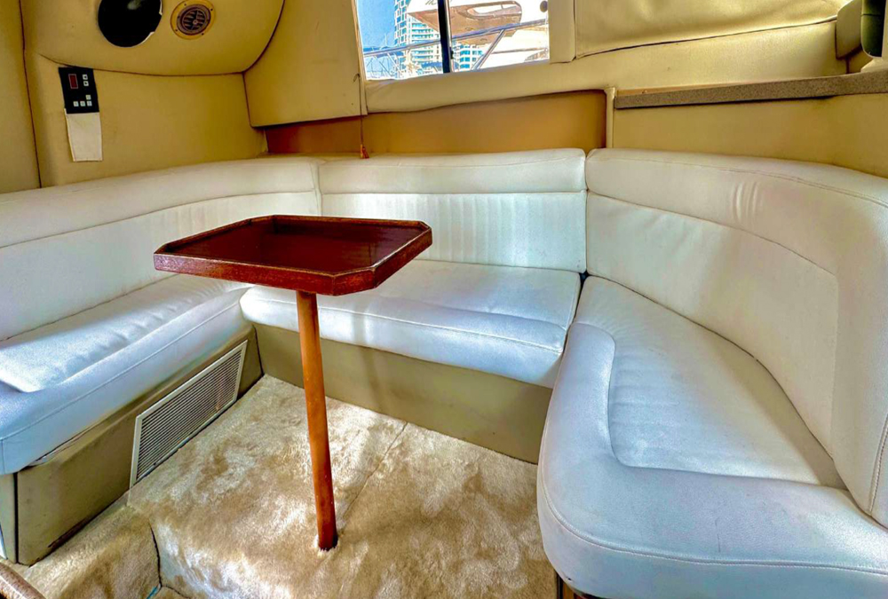 Our company is pleased to present the Pearl Voyage 34 FT Luxury Yacht for private yacht rental in Dubai at AED 299 per hour, accommodating up to 8 guests. This elegant yacht offers excellent amenities for a comfortable and enjoyable cruising experience, including a cozy lounge area, washroom, music system, and relaxing seating for leisure and entertainment.